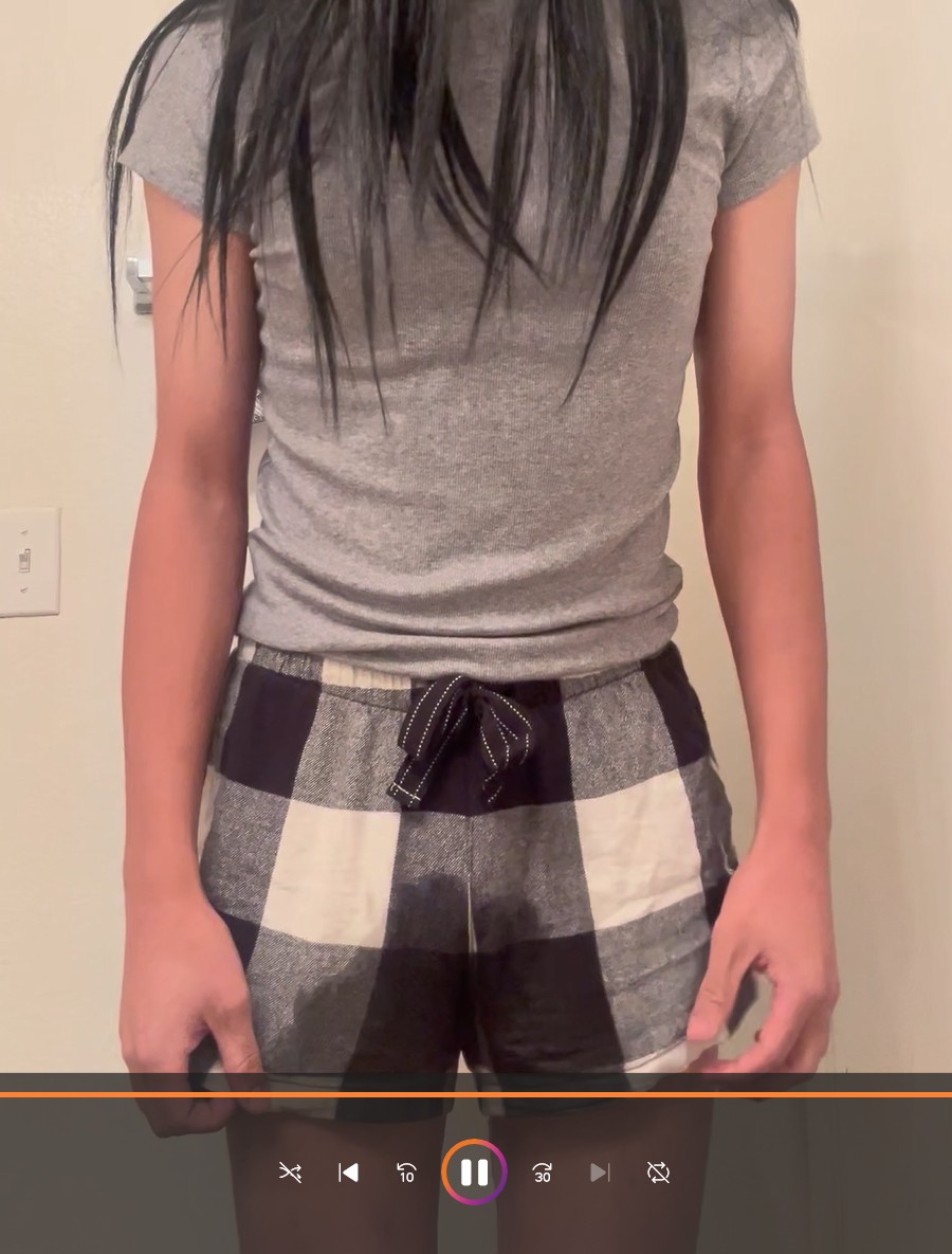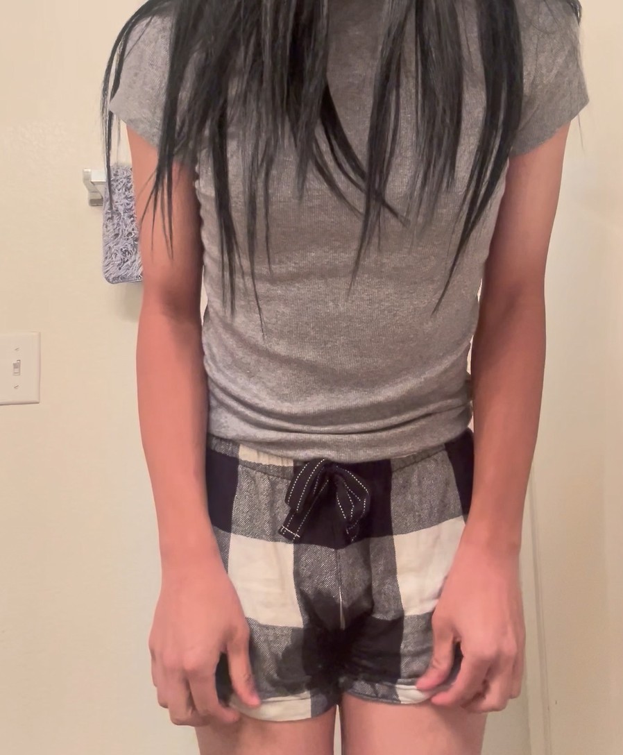 Пижамные шортики. очень подходят на роль униформы для описа. девушка даже поправила их подоткнула глубже между ног, чтобы намокли лучше.